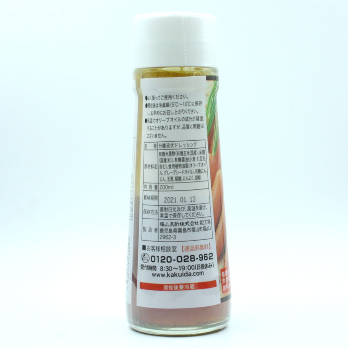 【栄養成分表示】1食(15g)あたり エネルギー:48kcal たんぱく質:0.3g 脂質:4.2g コレステロール:0mg 炭水化物:2.0g 食塩相当量:0.5g オレイン酸:1.0g 商品詳細 商品番号 kki-002 名称 分離液状ドレッシング 原材料名 有機米黒酢、有機醤油(小麦、大豆を含む)、食用植物油脂(オリーブオイル、グレープシードオイル)、有機にんじん、玉葱、粗糖、にんにく、胡椒 内容量 200ml 保存方法 直射日光及び高温を避けて常温保存してください。